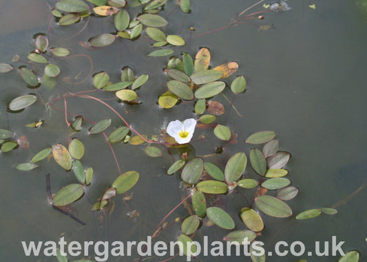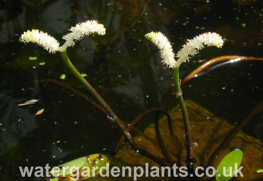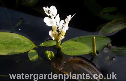 Deep water aquatic plants are those which grow on the bottom of the pond or on the deeper shelves, so that they have several inches of water over their crown. Their foliage and flowers either float on the surface like those of a waterlily, or emerge from the water. Unlike other marginal plants, deep water aquatic plants can't be grown out of the water in places such as damp flowerbeds - they do require at least some water over their crown. Those with upright stems offer important places for insects such as dragonflies to emerge, while those with floating leaves provide cover and shade for the pond. The deep water aquatics with floating leaves, such as Water Hawthorn or Floating Heart, can be a useful alternative if your pond is not large enough or sunny enough for waterlilies. They also tend to give the pond a more informal look than waterlilies do.