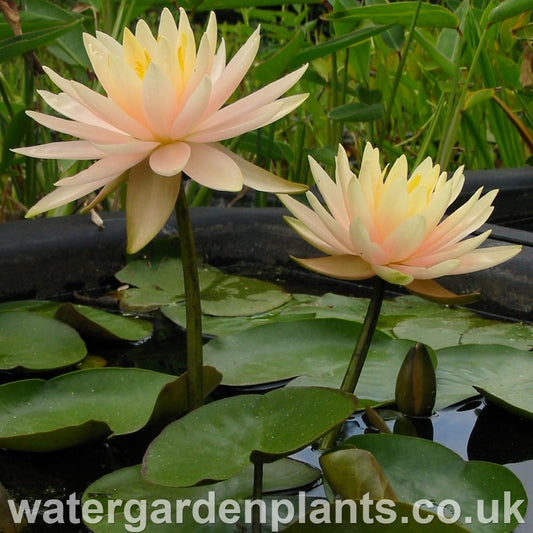 Waterlilies generally sit on the bottom of the pond (except in very deep ponds, where they may be placed on shelves) and their leaves grow upwards to float on the water surface. The blooms of traditional hardy waterlilies float on the water surface along with the leaves, but the blooms of tropical or subtropical waterlilies stand up above the water. Some modern waterlily varieties have been created by crossing hardy species with subtropical species, to create plants which thrive in our climate but whose flowers also stand up, giving the pond an exotic look.